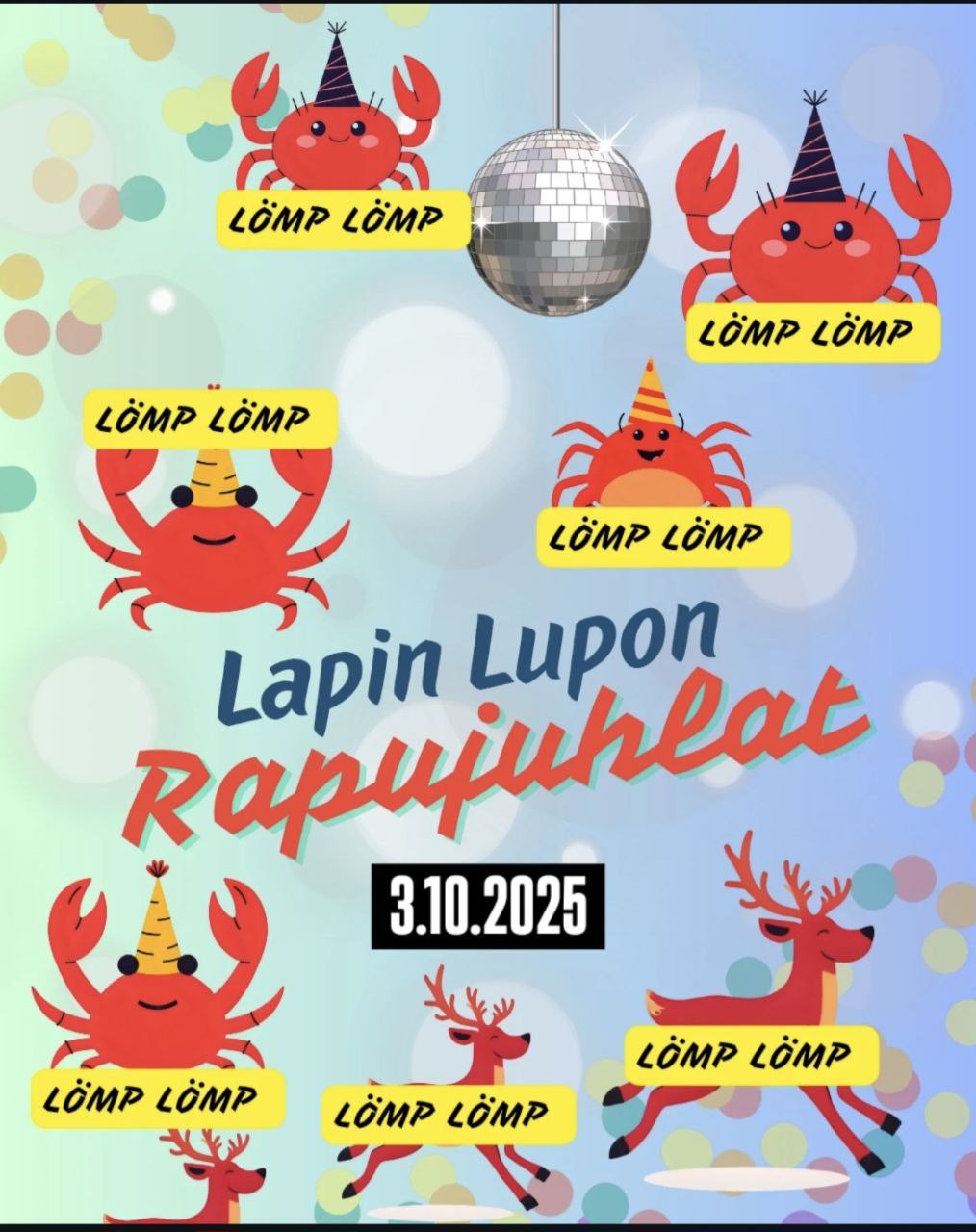 Kuuntele sie, ravut ne napsuttaa saksiaan. Lömppipuun hetelmät tuoksuu ja voit jo suussa maistaa vegaanisen skaakenin. Aai että, nyt se taas tullee. Nimittäin aika Lupon rapujuhulien. Ota kaverit mukaan ja tuu nauttimaan syksyn parhaasta tapahtumasta. Ei oo väliä mistä sie oot, koska me tiietään, että kaikki haluis oikeesti olla Lapista. Eli muukki ihmiset on tietenki tervetulleita nauttimaan illasta.